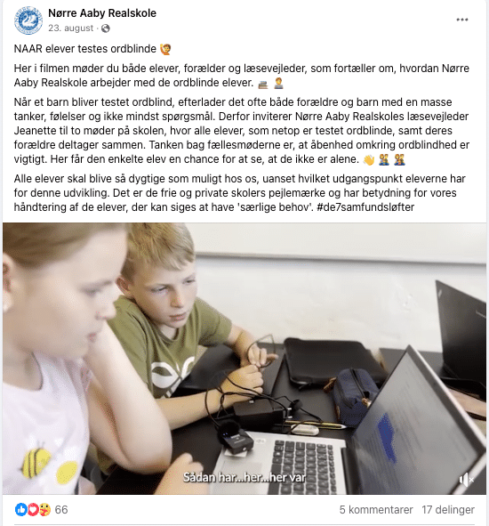 På Nørre Aaby Realskole kommunikerer man om Kodeks – de 7 samfundsløfter på skolens sociale medier. Skolen har f.eks. arbejdet med ordblindhed som et tema i deres kommunikation, hvor de bl.a. har lavet et opslag omhandlende vigtigheden i at være åben omkring at være ordblind. På samme tid har skolen relateret det til det samfundsløfte, der handler om skolens rummelighed og resultater. Et godt eksempel på, hvordan man tydeligt kan kommunikere til omverdenen, at skolen tager samfundsansvar.