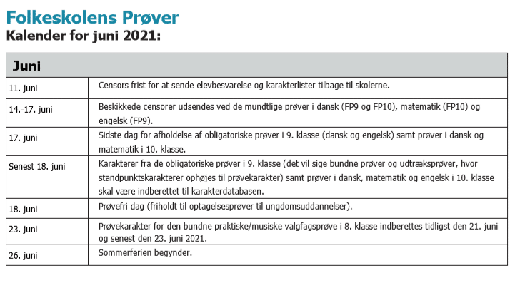 18. juniTidligst den 14. juni og senest den 18. juni 2021 skal karakterer for de obligatoriske og øvrige prøver i 9. klasse samt i prøverne i dansk, matematik og engelsk i 10. klasse være indberettet elektronisk